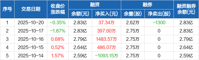 融资方面,当日融资买入675.6万元,融资偿还638.25万元,融资净买入37.34万元,连续4日净买入累计2404.59万元。融券方面,融券卖出0股,融券偿还1300股,融券余量2.62万股,融券余额15.07万元。融资融券余额合计2.83亿元。