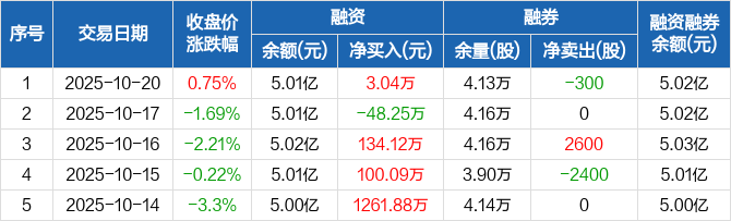融资方面,当日融资买入1337.88万元,融资偿还1334.83万元,融资净买入3.04万元。融券方面,融券卖出200股,融券偿还500股,融券余量4.13万股,融券余额72.56万元。融资融券余额合计5.02亿元。