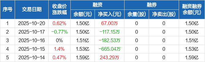 融资方面,当日融资买入309.32万元,融资偿还242.32万元,融资净买入67万元。融券方面,融券卖出0股,融券偿还0股,融券余量0股,融券余额0元。融资融券余额合计1.5亿元。