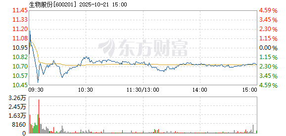 生物股份盘中快速反弹,5分钟内涨幅超过2%,截至9点30分,报11.09元,成交1010.09万元,换手率0.08%。