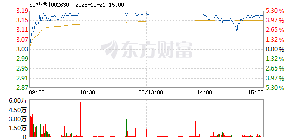 ST华西盘中打开涨停,现报3.17元,成交1.95亿元,换手率6.04%。该股之前于10点21分涨停。