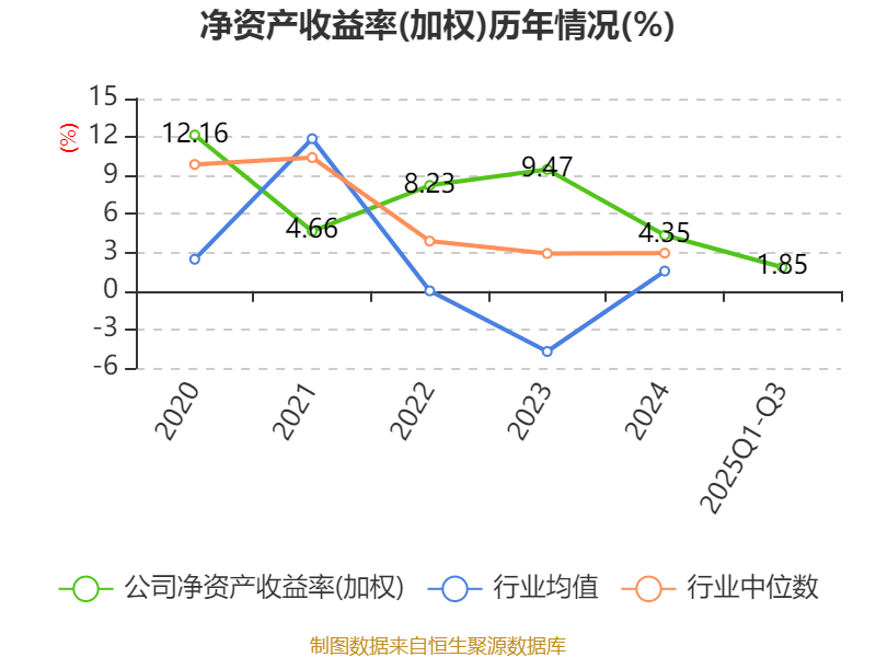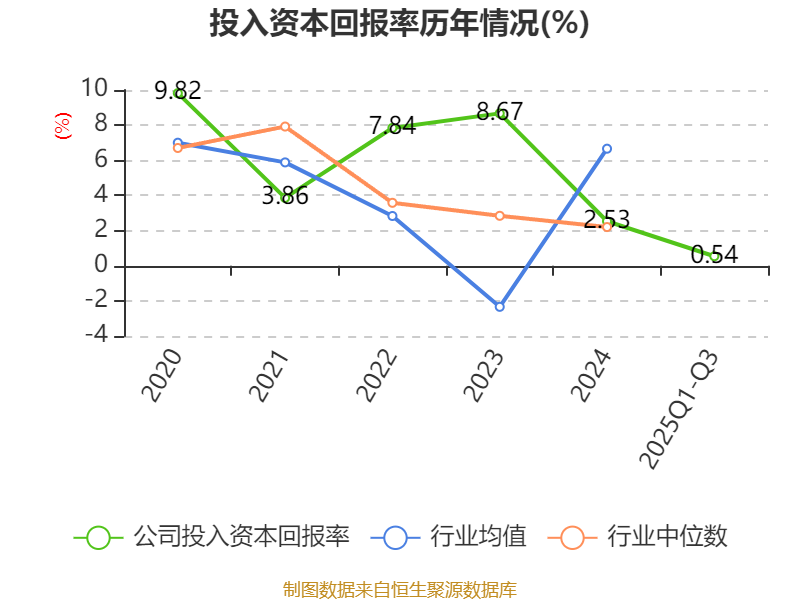 盈利能力方面, 2025年前三季度公司加权平均净资产收益率为1.85%,同比下降0.55个百分点。公司2025年前三季度投入资本回报率为0.54%,较上年同期下降0.69个百分点。