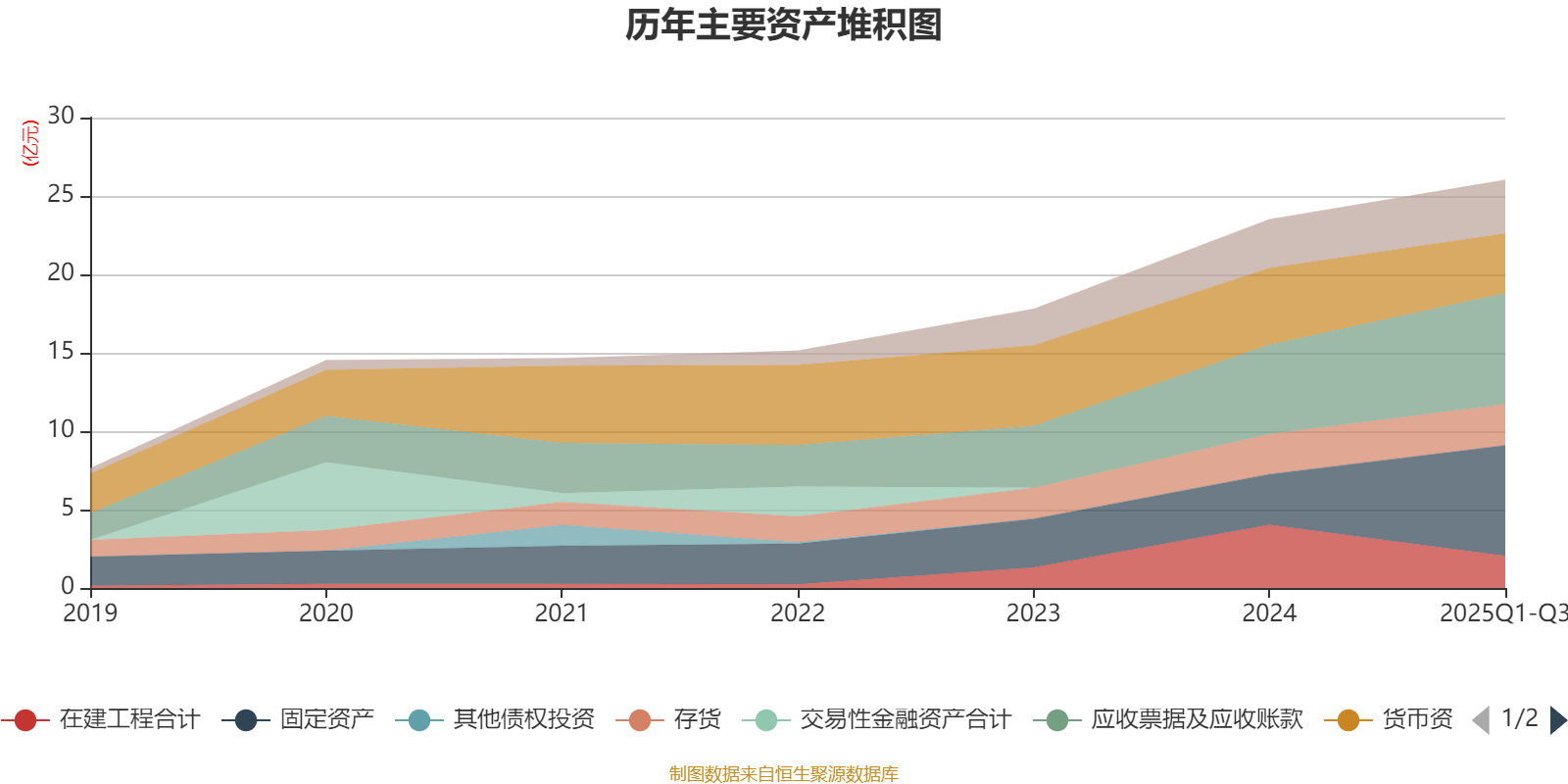 资产重大变化方面,截至2025年三季度末,公司固定资产较上年末增加118.29%,占公司总资产比重上升13.34个百分点;在建工程合计较上年末减少48.99%,占公司总资产比重下降9.23个百分点;货币资金较上年末减少22.35%,占公司总资产比重下降6.21个百分点;应收票据及应收账款较上年末增加24.71%,占公司总资产比重上升3.06个百分点。