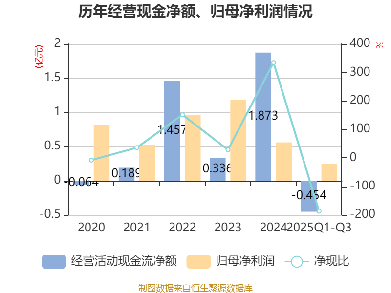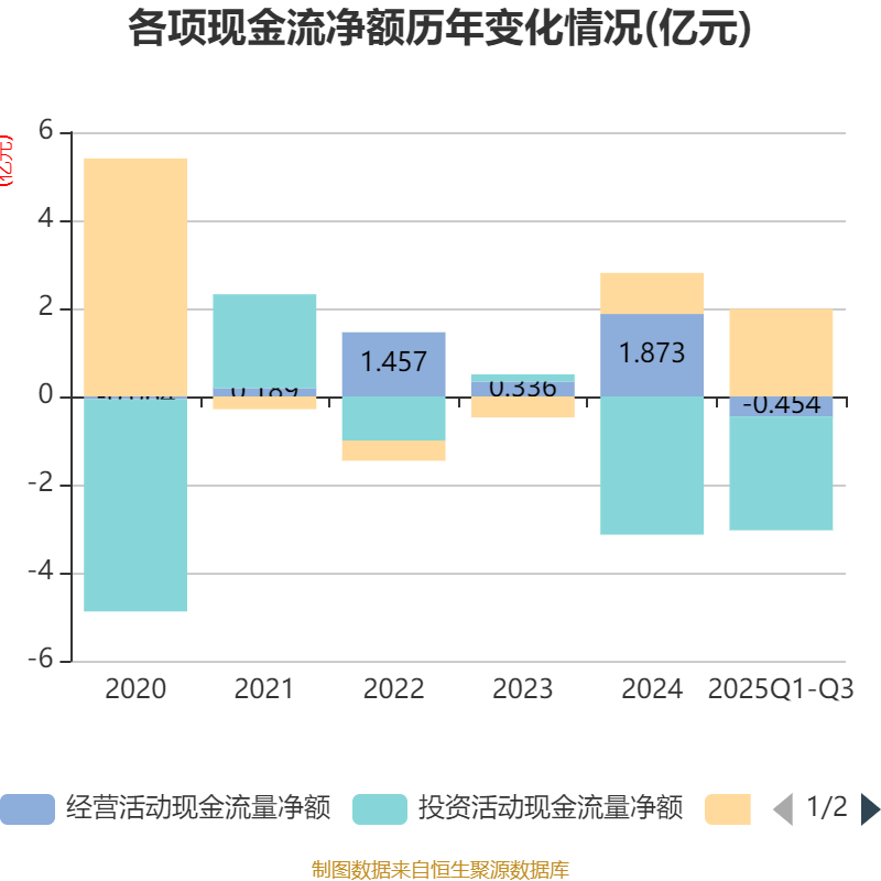 2025年前三季度,公司经营活动现金流净额为-4544.26万元,同比减少1.05亿元;筹资活动现金流净额1.99亿元,同比增加9691.45万元;投资活动现金流净额-2.58亿元,上年同期为-2.24亿元。