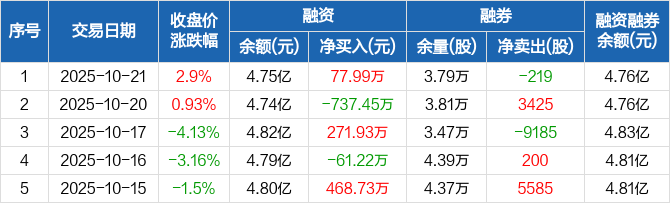 融资方面,当日融资买入2151.82万元,融资偿还2073.82万元,融资净买入77.99万元。融券方面,融券卖出400股,融券偿还619股,融券余量3.79万股,融券余额122.46万元。融资融券余额合计4.76亿元。