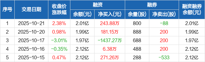 融资方面,当日融资买入1134.54万元,融资偿还890.67万元,融资净买入243.88万元。融券方面,融券卖出200股,融券偿还288股,融券余量800股,融券余额4.58万元。融资融券余额合计2.01亿元。