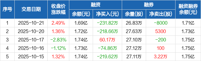 融资方面,当日融资买入859.01万元,融资偿还1090.83万元,融资净偿还231.82万元。融券方面,融券卖出5400股,融券偿还1.34万股,融券余量26.83万股,融券余额143.54万元。融资融券余额合计1.71亿元。