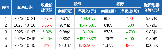 瑞可达融资融券信息显示,2025年10月21日融资净偿还469.41万元;融资余额9.67亿元,较前一日下降0.48%。