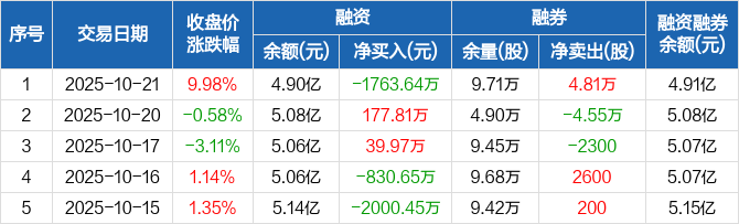 融资方面,当日融资买入2345.04万元,融资偿还4108.68万元,融资净偿还1763.64万元。融券方面,融券卖出5.04万股,融券偿还2300股,融券余量9.71万股,融券余额109.14万元。融资融券余额合计4.91亿元。