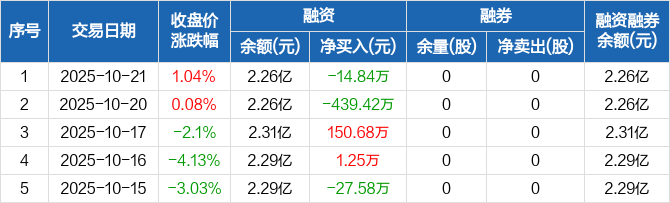 融资方面,当日融资买入1099.64万元,融资偿还1114.48万元,融资净偿还14.84万元。融券方面,融券卖出0股,融券偿还0股,融券余量0股,融券余额0元。融资融券余额合计2.26亿元。
