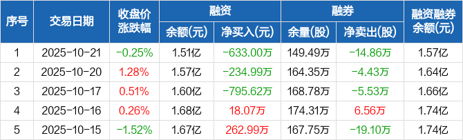 融资方面,当日融资买入368.75万元,融资偿还1001.75万元,融资净偿还633万元,连续3日净偿还累计1663.61万元。融券方面,融券卖出4200股,融券偿还15.28万股,融券余量149.49万股,融券余额591.98万元。融资融券余额合计1.57亿元。