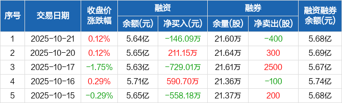 融资方面,当日融资买入940.53万元,融资偿还1086.62万元,融资净偿还146.09万元。融券方面,融券卖出100股,融券偿还500股,融券余量21.6万股,融券余额365.69万元。融资融券余额合计5.68亿元。
