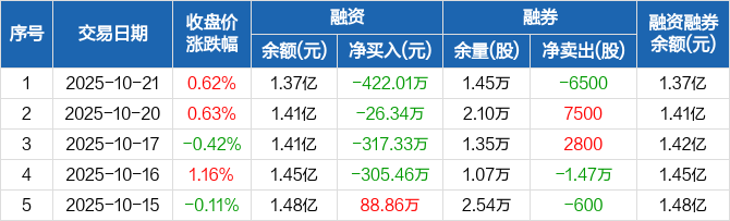 融资方面,当日融资买入320.98万元,融资偿还742.99万元,融资净偿还422.01万元,连续4日净偿还累计1071.14万元。融券方面,融券卖出700股,融券偿还7200股,融券余量1.45万股,融券余额14.05万元。融资融券余额合计1.37亿元。