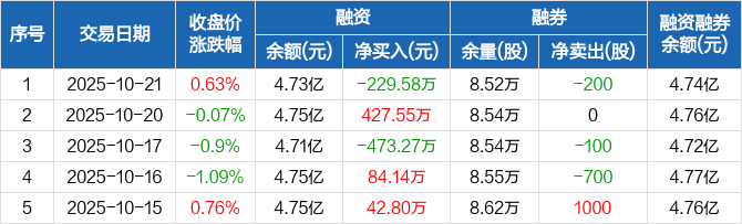 融资方面,当日融资买入271.19万元,融资偿还500.77万元,融资净偿还229.58万元。融券方面,融券卖出0股,融券偿还200股,融券余量8.52万股,融券余额122.9万元。融资融券余额合计4.74亿元。