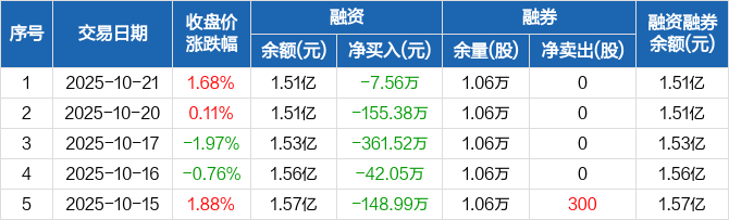 融资方面,当日融资买入346.79万元,融资偿还354.35万元,融资净偿还7.56万元,连续5日净偿还累计715.49万元。融券方面,融券卖出0股,融券偿还0股,融券余量1.06万股,融券余额9.64万元。融资融券余额合计1.51亿元。