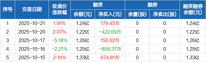 融资方面,当日融资买入853.95万元,融资偿还674.51万元,融资净买入179.45万元。融券方面,融券卖出0股,融券偿还0股,融券余量0股,融券余额0元。融资融券余额合计1.24亿元。