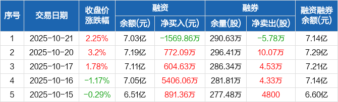 融资方面,当日融资买入2958.23万元,融资偿还4528.09万元,融资净偿还1569.86万元。融券方面,融券卖出600股,融券偿还5.84万股,融券余量290.63万股,融券余额1054.99万元。融资融券余额合计7.14亿元。