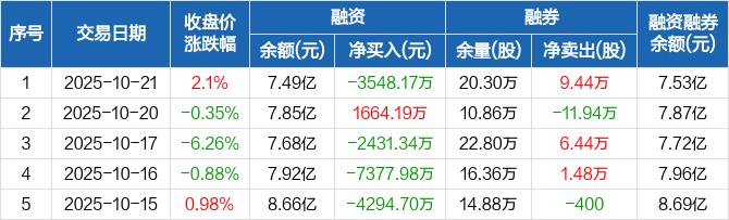 融资方面,当日融资买入8675.43万元,融资偿还1.22亿元,融资净偿还3548.17万元。融券方面,融券卖出10.11万股,融券偿还6700股,融券余量20.3万股,融券余额414.32万元。融资融券余额合计7.53亿元。