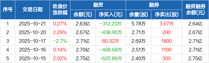 融资方面,当日融资买入1501.27万元,融资偿还1813.51万元,融资净偿还312.23万元。融券方面,融券卖出3.18万股,融券偿还1100股,融券余量5.78万股,融券余额85.43万元。融资融券余额合计2.64亿元。