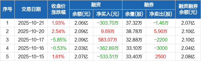 融资方面,当日融资买入1025.32万元,融资偿还1329.01万元,融资净偿还303.7万元。融券方面,融券卖出1.36万股,融券偿还2.82万股,融券余量37.32万股,融券余额138.08万元。融资融券余额合计2.07亿元。