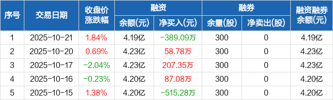 融资方面,当日融资买入1237.37万元,融资偿还1626.46万元,融资净偿还389.09万元。融券方面,融券卖出0股,融券偿还0股,融券余量300股,融券余额1329元。融资融券余额合计4.19亿元。