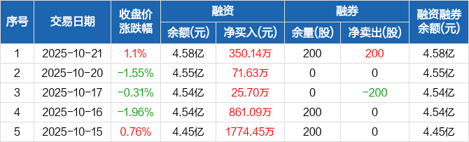 融资方面,当日融资买入1012.23万元,融资偿还662.09万元,融资净买入350.14万元,连续8日净买入累计6870.14万元。融券方面,融券卖出200股,融券偿还0股,融券余量200股,融券余额1288元。融资融券余额合计4.58亿元。