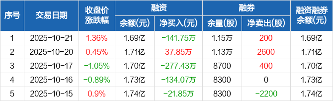 康力电梯融资融券信息显示,2025年10月21日融资净偿还141.75万元;融资余额1.69亿元,较前一日下降0.83%。