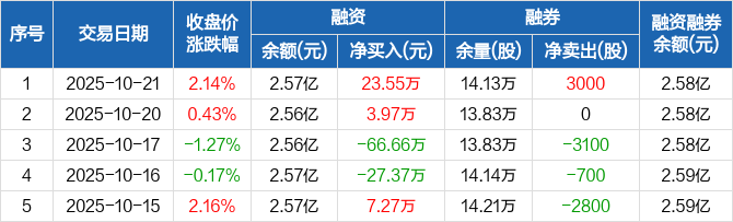 融资方面,当日融资买入312.01万元,融资偿还288.46万元,融资净买入23.55万元。融券方面,融券卖出3600股,融券偿还600股,融券余量14.13万股,融券余额168.71万元。融资融券余额合计2.58亿元。