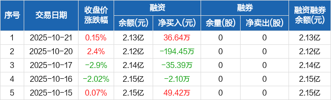 融资方面,当日融资买入277.28万元,融资偿还240.65万元,融资净买入36.64万元。融券方面,融券卖出0股,融券偿还0股,融券余量0股,融券余额0元。融资融券余额合计2.13亿元。