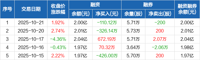 融资方面,当日融资买入766.81万元,融资偿还876.93万元,融资净偿还110.12万元。融券方面,融券卖出0股,融券偿还200股,融券余量5.71万股,融券余额39.34万元。融资融券余额合计2亿元。