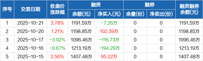 融资方面,当日融资买入517.92万元,融资偿还525.18万元,融资净偿还7.26万元。融券方面,融券卖出0份,融券偿还0份,融券余量0份,融券余额0元。融资融券余额合计1191.59万元。