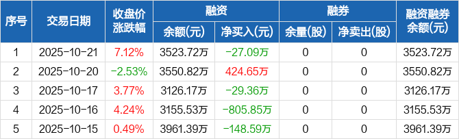 融资方面,当日融资买入898.11万元,融资偿还925.2万元,融资净偿还27.09万元。融券方面,融券卖出0股,融券偿还0股,融券余量0股,融券余额0元。融资融券余额合计3523.72万元。
