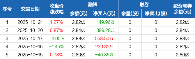 融资方面,当日融资买入890.46万元,融资偿还1040.42万元,融资净偿还149.96万元。融券方面,融券卖出0股,融券偿还0股,融券余量0股,融券余额0元。融资融券余额合计2.82亿元。
