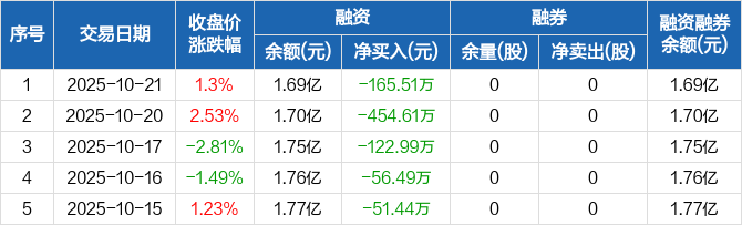 融资方面,当日融资买入429.73万元,融资偿还595.24万元,融资净偿还165.51万元,连续7日净偿还累计1319.27万元。融券方面,融券卖出0股,融券偿还0股,融券余量0股,融券余额0元。融资融券余额合计1.69亿元。