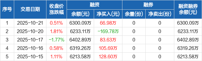 融资方面,当日融资买入545.69万元,融资偿还478.71万元,融资净买入66.98万元。融券方面,融券卖出0份,融券偿还0份,融券余量0份,融券余额0元。融资融券余额合计6300.09万元。