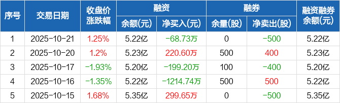 融资方面,当日融资买入1139.45万元,融资偿还1208.18万元,融资净偿还68.73万元。融券方面,融券卖出0股,融券偿还500股,融券余量0股,融券余额0元。融资融券余额合计5.22亿元。
