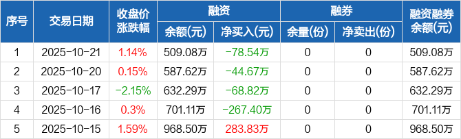 融资方面,当日融资买入179.67万元,融资偿还258.21万元,融资净偿还78.54万元,连续4日净偿还累计459.43万元。融券方面,融券卖出0份,融券偿还0份,融券余量0份,融券余额0元。融资融券余额合计509.08万元。