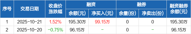 融资方面,当日融资买入212.7万元,融资偿还113.55万元,融资净买入99.15万元。融券方面,融券卖出0份,融券偿还0份,融券余量0份,融券余额0元。融资融券余额合计195.3万元。