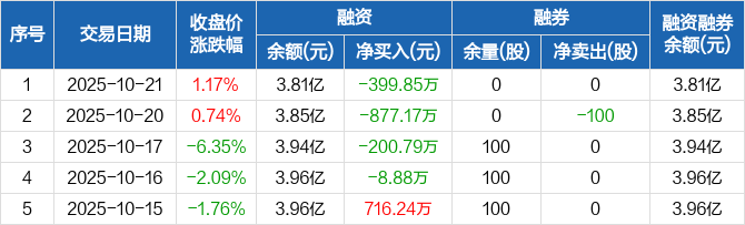 融资方面,当日融资买入411.1万元,融资偿还810.95万元,融资净偿还399.85万元,连续4日净偿还累计1486.7万元。融券方面,融券卖出0股,融券偿还0股,融券余量0股,融券余额0元。融资融券余额合计3.81亿元。