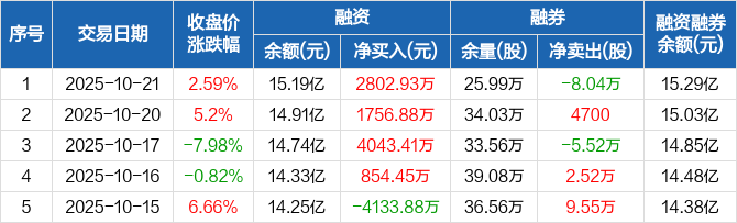 融资方面,当日融资买入1.72亿元,融资偿还1.44亿元,融资净买入2802.93万元,连续4日净买入累计9457.67万元。融券方面,融券卖出4.35万股,融券偿还12.39万股,融券余量25.99万股,融券余额938.24万元。融资融券余额合计15.29亿元。
