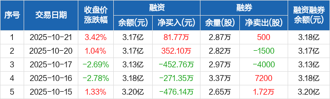 融资方面,当日融资买入2018.77万元,融资偿还1937.01万元,融资净买入81.77万元。融券方面,融券卖出500股,融券偿还0股,融券余量2.87万股,融券余额17.33万元。融资融券余额合计3.18亿元。