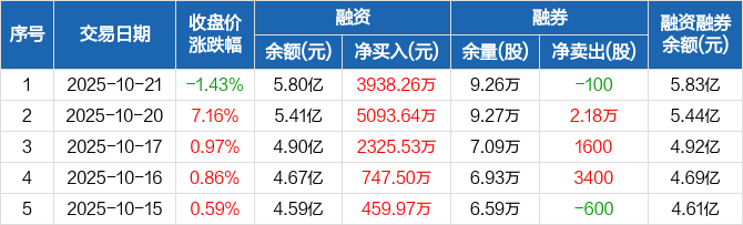 融资方面,当日融资买入1.14亿元,融资偿还7483.89万元,融资净买入3938.26万元,连续7日净买入累计1.49亿元。融券方面,融券卖出1900股,融券偿还2000股,融券余量9.26万股,融券余额255.46万元。融资融券余额合计5.83亿元。