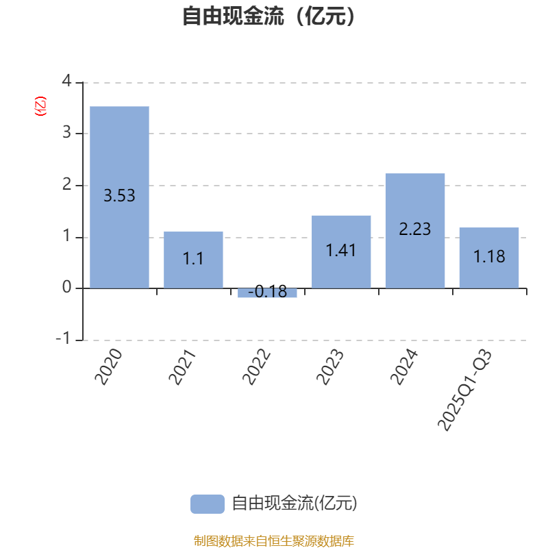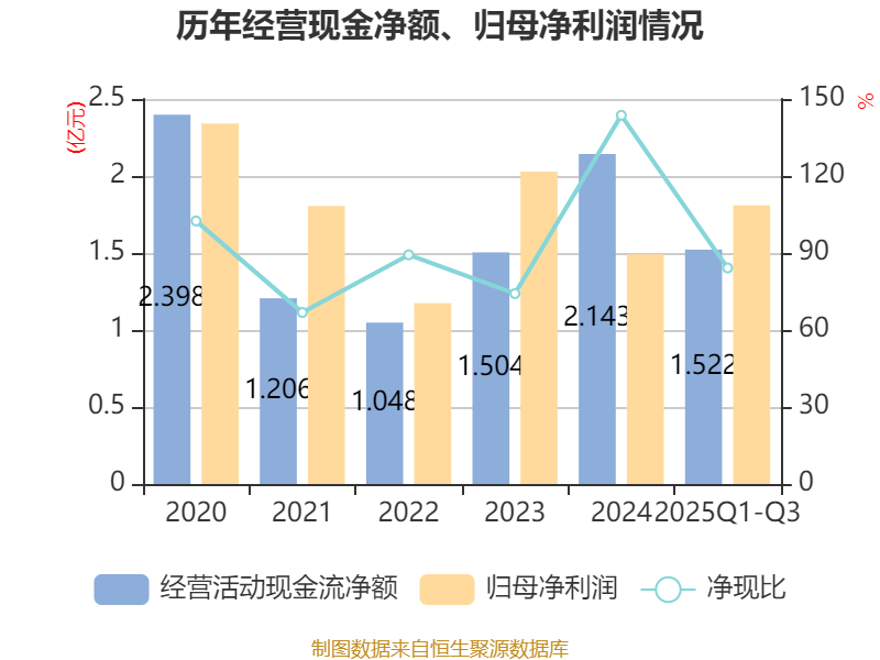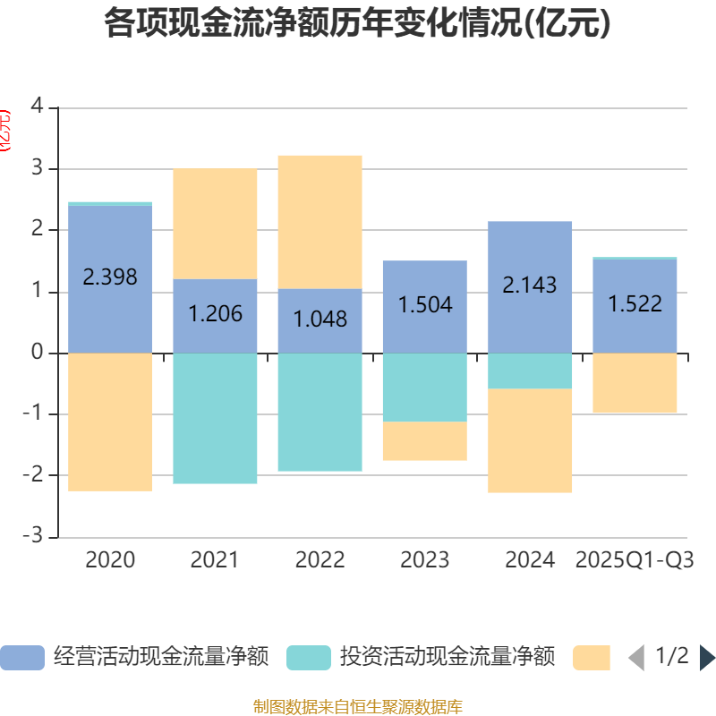 2025年前三季度,公司经营活动现金流净额为1.52亿元,同比增长16.01%;筹资活动现金流净额-9744.51万元,同比增加6967.72万元;投资活动现金流净额398.15万元,上年同期为-2188.13万元。