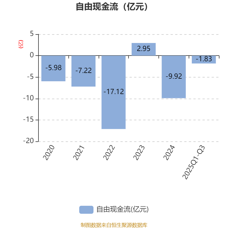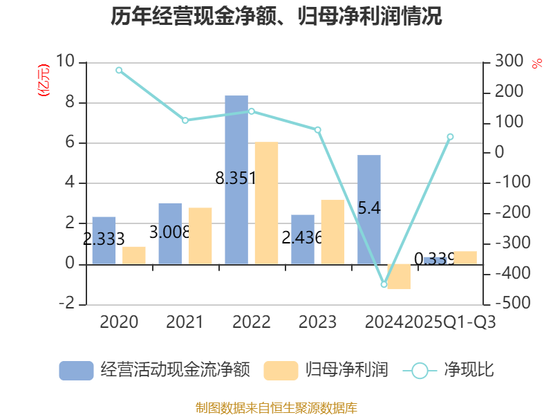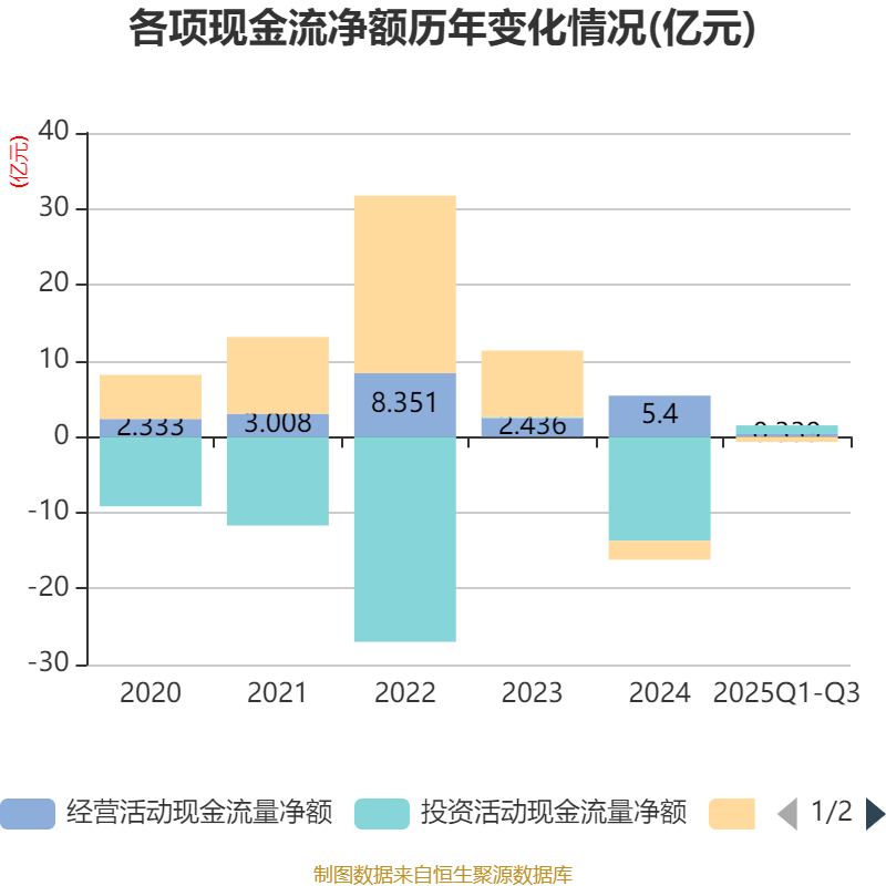 2025年前三季度,公司经营活动现金流净额为3390.31万元,同比下降85.26%;筹资活动现金流净额-6867.24万元,同比增加7788.7万元;投资活动现金流净额1.15亿元,上年同期为-9.89亿元。