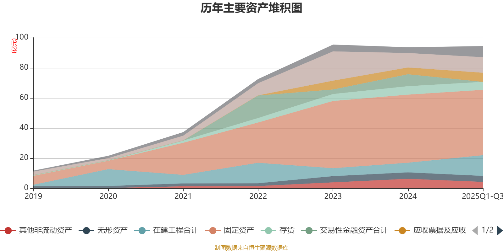 资产重大变化方面,截至2025年三季度末,公司交易性金融资产合计较上年末减少100%,占公司总资产比重下降8.46个百分点;在建工程合计较上年末增加115.17%,占公司总资产比重上升7.74个百分点;其他流动资产较上年末增加590.3%,占公司总资产比重上升2.97个百分点;固定资产较上年末减少3.97%,占公司总资产比重下降2.31个百分点。