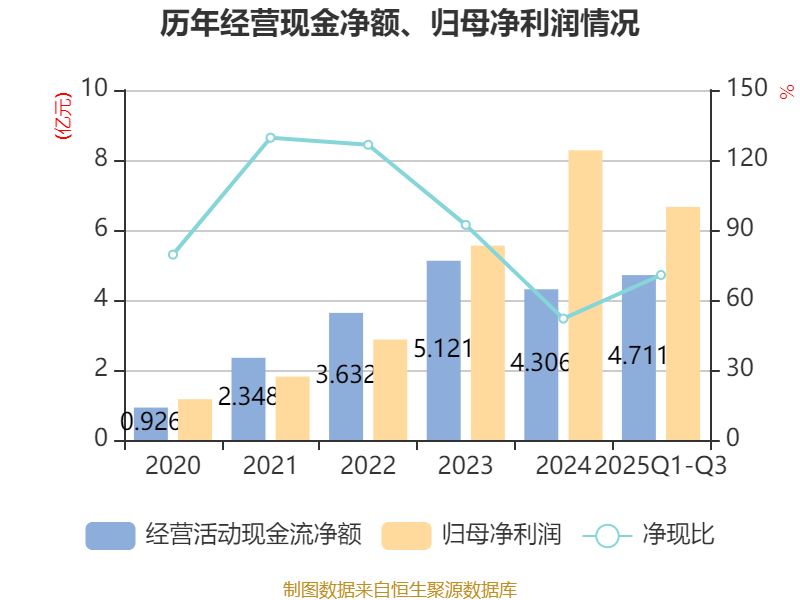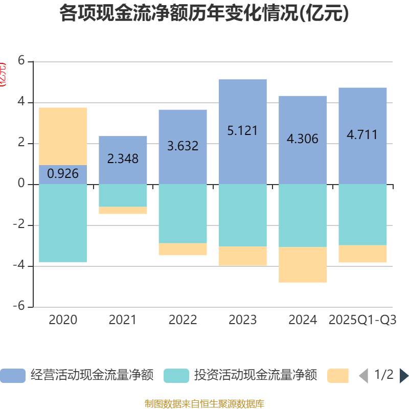 2025年前三季度,公司经营活动现金流净额为4.71亿元,同比增长61.33%;筹资活动现金流净额-8391.79万元,同比增加8745.36万元;投资活动现金流净额-2.99亿元,上年同期为-2亿元。