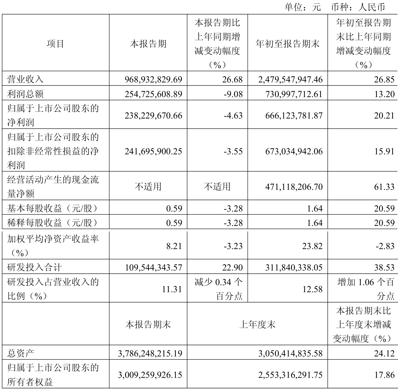 中证智能财讯特宝生物(688278)10月23日披露2025年第三季度报告。前三季度公司实现营业总收入24.8亿元,同比增长26.85%;归母净利润6.66亿元,同比增长20.21%;扣非净利润6.73亿元,同比增长15.91%;经营活动产生的现金流量净额为4.71亿元,同比增长61.33%;报告期内,特宝生物基本每股收益为1.64元,加权平均净资产收益率为23.82%。