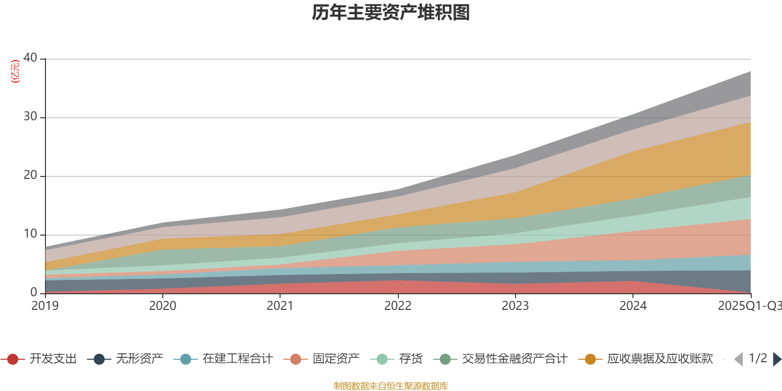资产重大变化方面,截至2025年三季度末,公司开发支出较上年末减少95.25%,占公司总资产比重下降6.59个百分点;无形资产较上年末增加121.63%,占公司总资产比重上升4.4个百分点;应收票据及应收账款较上年末增加11.65%,占公司总资产比重下降2.66个百分点;商誉占公司总资产的1.7%,上年末为0。