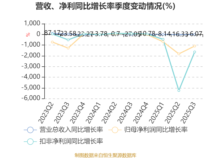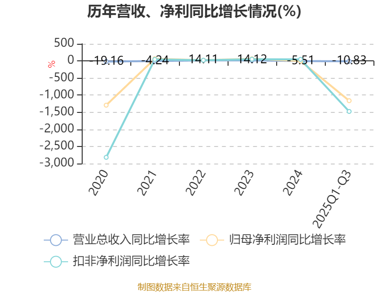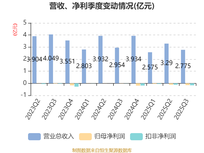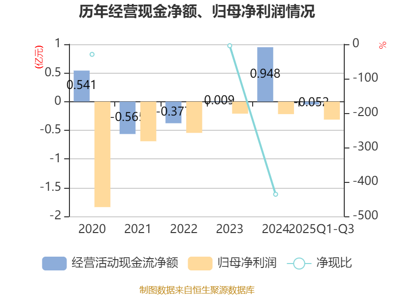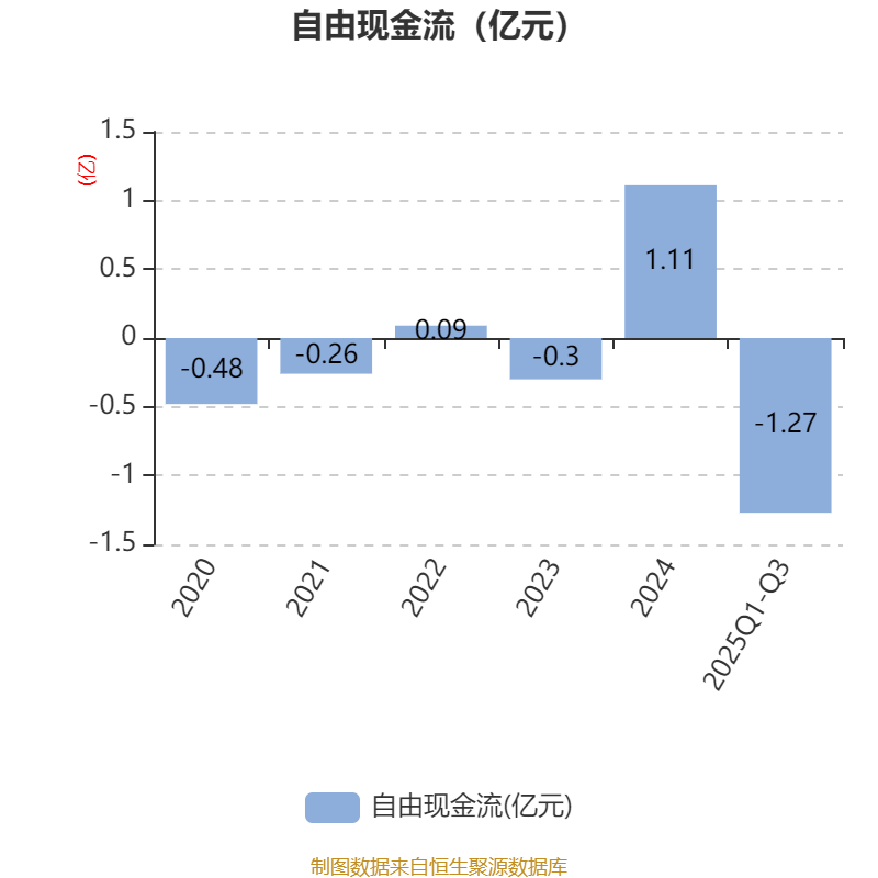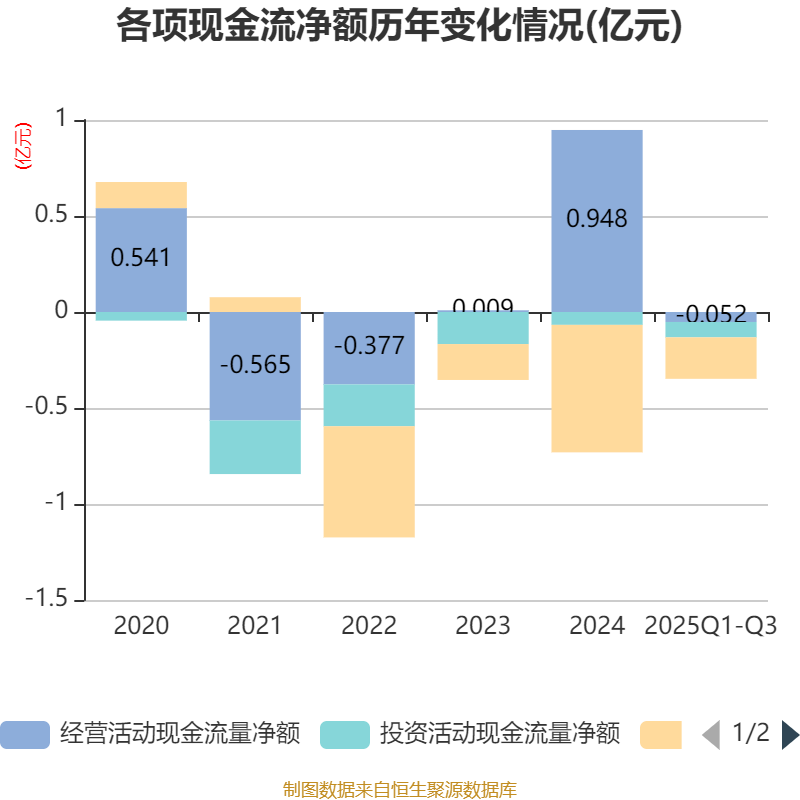 2025年前三季度,公司经营活动现金流净额为-516.77万元,同比减少4827.01万元;筹资活动现金流净额-2160.41万元,同比增加899.94万元;投资活动现金流净额-804.04万元,上年同期为-498.16万元。