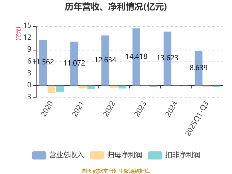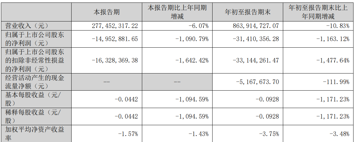 中证智能财讯蓝英装备(300293)10月23日披露2025年第三季度报告。前三季度公司实现营业总收入8.64亿元,同比下降10.83%;归母净利润亏损3141.04万元,上年同期亏损248.67万元;扣非净利润亏损3314.43万元,上年同期亏损210.09万元;经营活动产生的现金流量净额为-516.77万元,上年同期为4310.25万元;报告期内,蓝英装备基本每股收益为-0.0928元,加权平均净资产收益率为-3.75%。